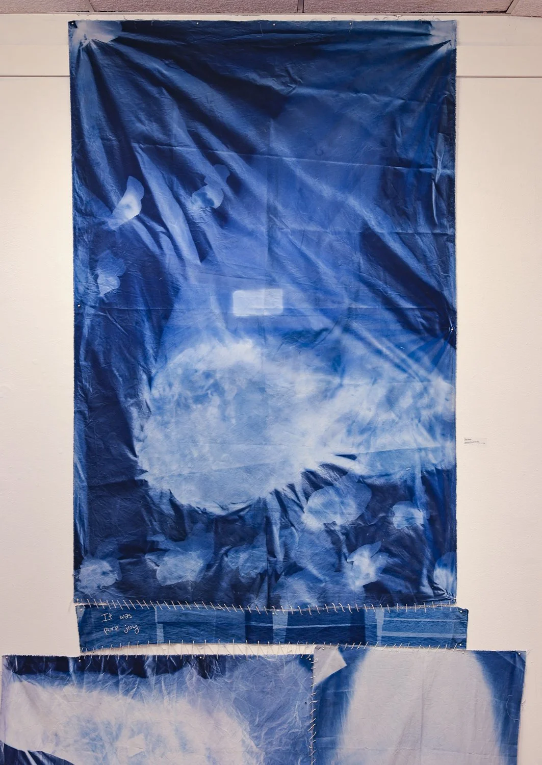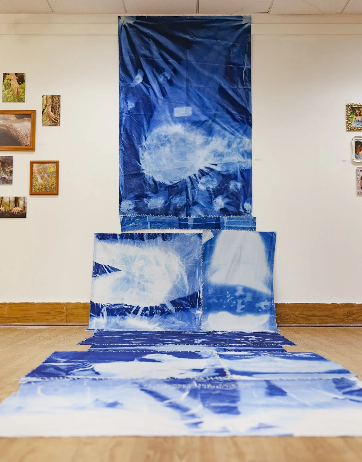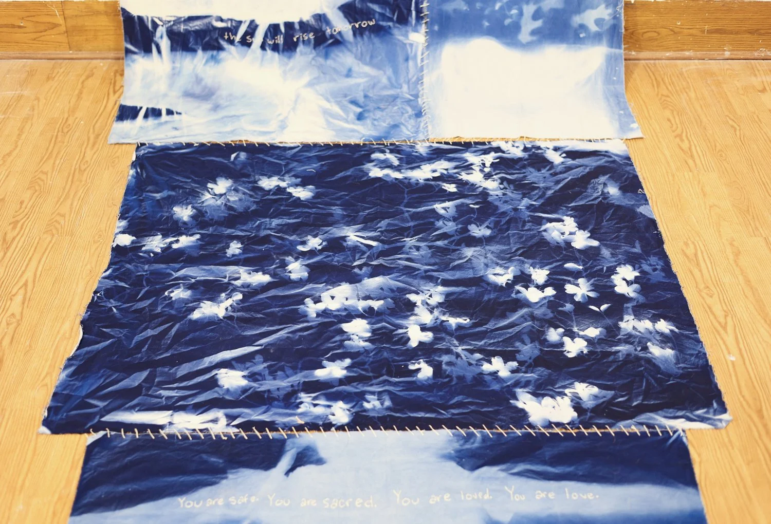 I have used The Slowness of the Sun to document how the two intersect and reflect on how that intersection creates a beautiful opportunity for reflection and growth in each area separately and together as one. One of my current realities is living with chronic illness and learning how to adapt to this new challenge. Chronic illness has demanded intention and diligence in self-care and my every day routine, which has shifted self-care from something that has become a chore. I’ve used these Cyanotype prints as a way to take intention back from the hold chronic illness has on it and take it into my own hands. I created the cyanotype chemicals with naturally sourced water from local places that have served as slow and intentional spaces for me in the past. I returned to these places and made one-to-one documentation of times of meditation, mindfulness, movement and connection. I paired these printed with handwoven text from journal entries, poems, mantras and reflections. Using a hands-on method like Cyanotupe has allowed me to slow down and engage in intention through every process of this expiration while reflecting on the process that came before it, whether it be collecting water, exposing prints in the sun, or bringing journal entries outside of their original space.